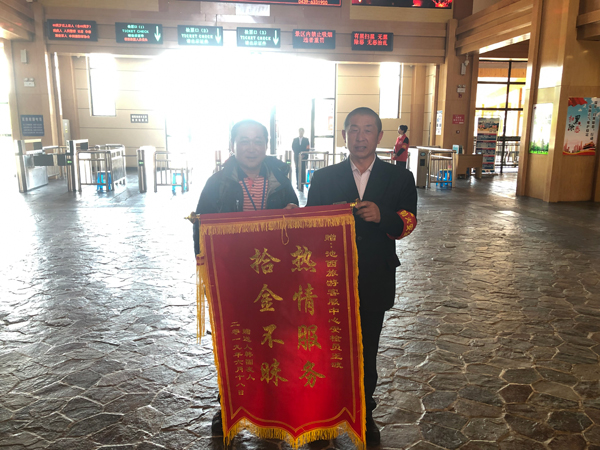 6月24日,池西游客服務(wù)中心副經(jīng)理王金鵬又接待了一位前來贈(zèng)送錦旗的游客。因?yàn)榘矙z員王波在6月13日,拾到一部三星手機(jī),并及時(shí)上交,通過多方了解才知道,失主是一位韓國(guó)游客,手機(jī)的及時(shí)歸還也為該游客省去了很多不必要的麻煩。所以,委托旅行社贈(zèng)送錦旗一面,稱贊王波拾金不昧的精神。同時(shí)這也是這個(gè)月里池西游客服務(wù)中心第二次有游客贈(zèng)送錦旗,這是對(duì)景區(qū)員工優(yōu)質(zhì)服務(wù)高度的認(rèn)可與贊揚(yáng)。