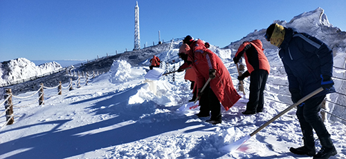 他們是寒冬里的一抹橘,時(shí)刻溫暖著游客的心。中午12時(shí)40分,天池迎來(lái)了當(dāng)天的第一批游客,吳經(jīng)理立即抽調(diào)了幾名員工去為游客提供安全和相關(guān)的暖心服務(wù)工作。游客們興高采烈地觀賞著雪后天池的壯美景觀,不斷贊嘆著大自然的鬼斧神工。游客們開(kāi)心滿意的笑容,讓主峰管理部的員工們倍感自豪,經(jīng)過(guò)大家的不懈努力,游覽棧道的拓寬工作,已于當(dāng)日15時(shí)圓滿結(jié)束。