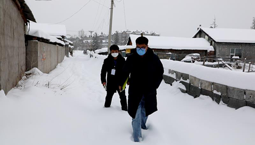 2月17日,長白山地區(qū)迎來了入冬以來規(guī)模最大的一場大雪,這為第二天的排查工作增添了不小困難。清早,雪花還沒有停止,漫天白雪里,我們依然聽到了“咯吱咯吱”的踩雪聲,原來股份公司的志愿者一早就已經(jīng)趟著膝蓋深的積雪,來到指定區(qū)域進行入戶排查登記。天寒地凍、大雪紛飛,雪水濕透了襪子,寒風刺痛著臉頰,也不能阻擋股份人和全區(qū)人民一道戰(zhàn)勝疫情的信念和決心。